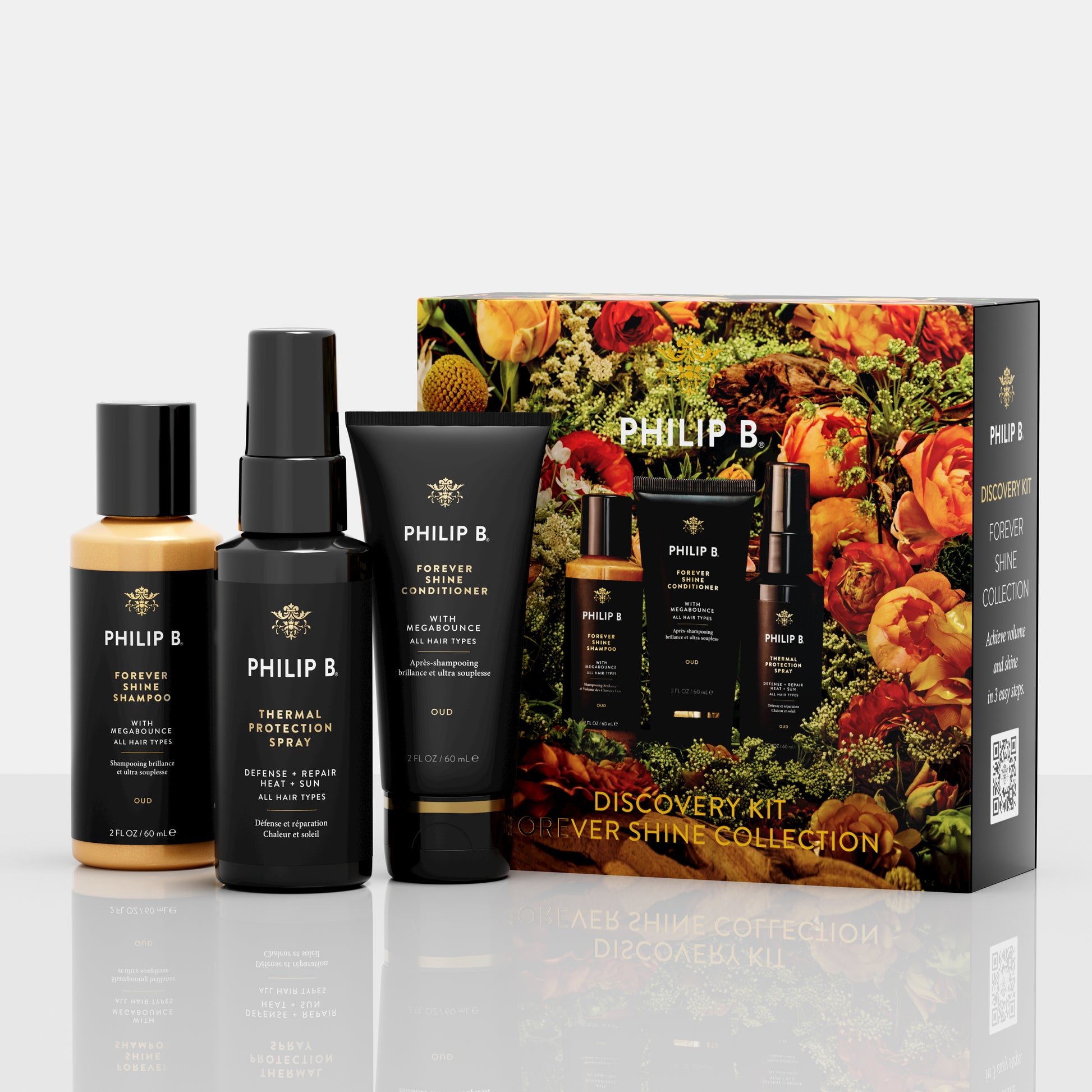 套裝包括皇家烏木沉香亮澤洗髮水 60ml、皇家烏木沉香閃亮護髮素 60ml、抗熱修護噴霧 60ml